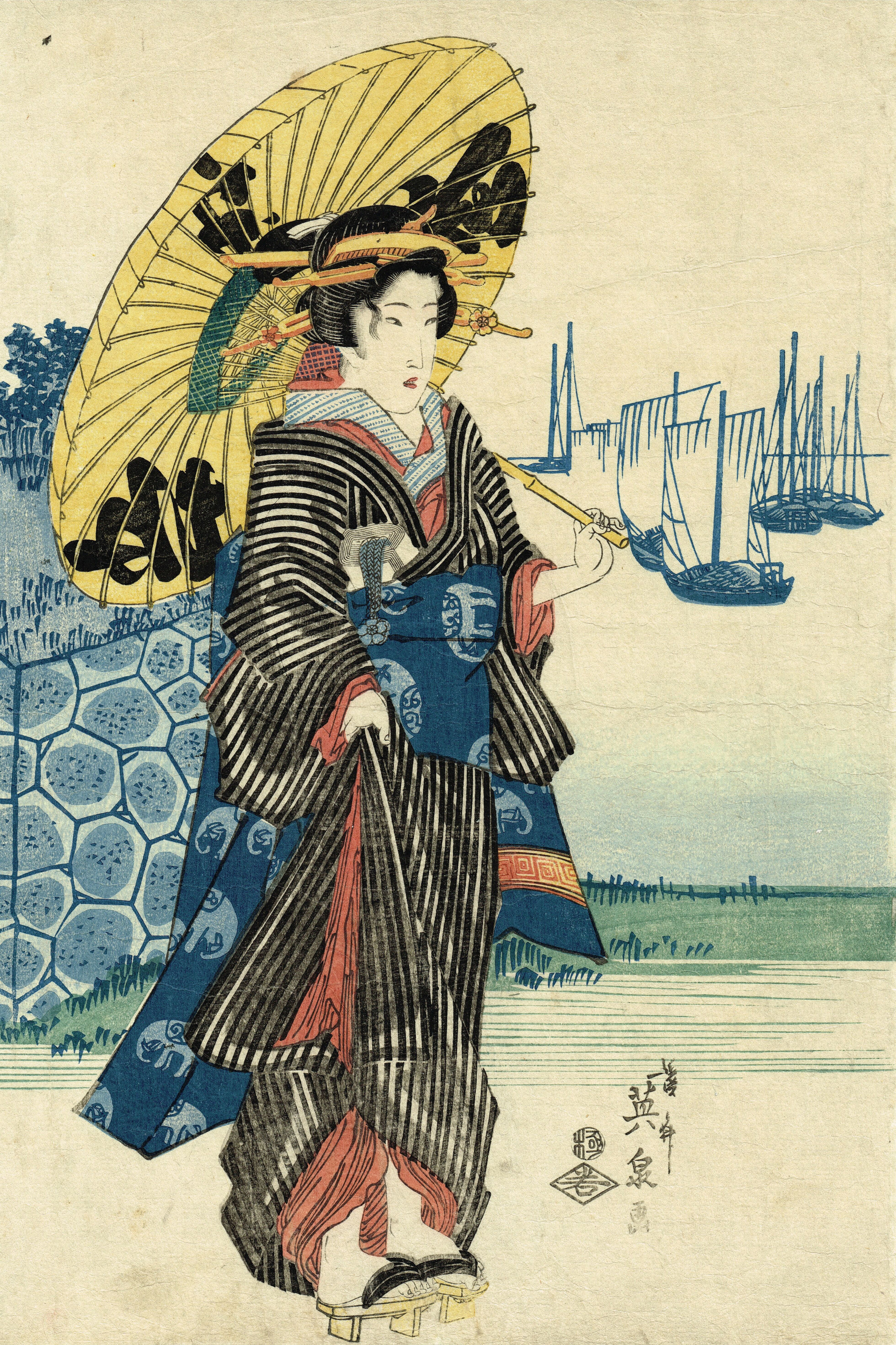 KEISAI EISEN (1790-1848): Junge Frau unter einem Sonnenschirm vor einer in Blau gedruckten Hafenszene |