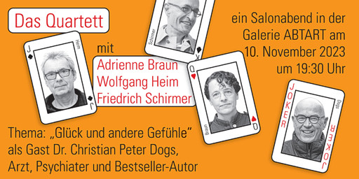 Das Quartett ist ein Format der KARIN ABT-STRAUBINGER Stiftung. Bei dem Salonabend, der in Abständen in den Räumen der Galerie ABTART stattfindet, werden aktuelle Themen aus dem Kulturbetrieb diskutiert.